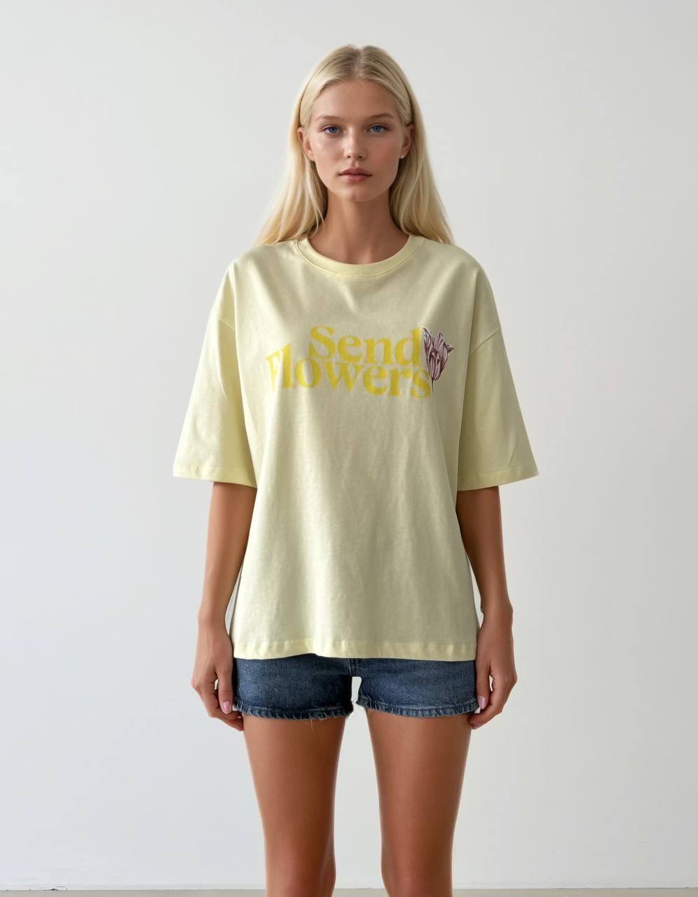 Turn heads with this playful relaxed-fit tee that celebrates all things floral. The front showcases a cheerful "Send Flowers" message paired with a vibrant print, while the back features a stunning tulip design that adds an extra dose of botanical charm. Made from breathable 100% cotton and crafted in Turkey, this spring-summer essential is as comfortable as it is eye-catching. Whether you're styling it with denim or pairing it with linen shorts, this tee brings effortless personality to every outfit.