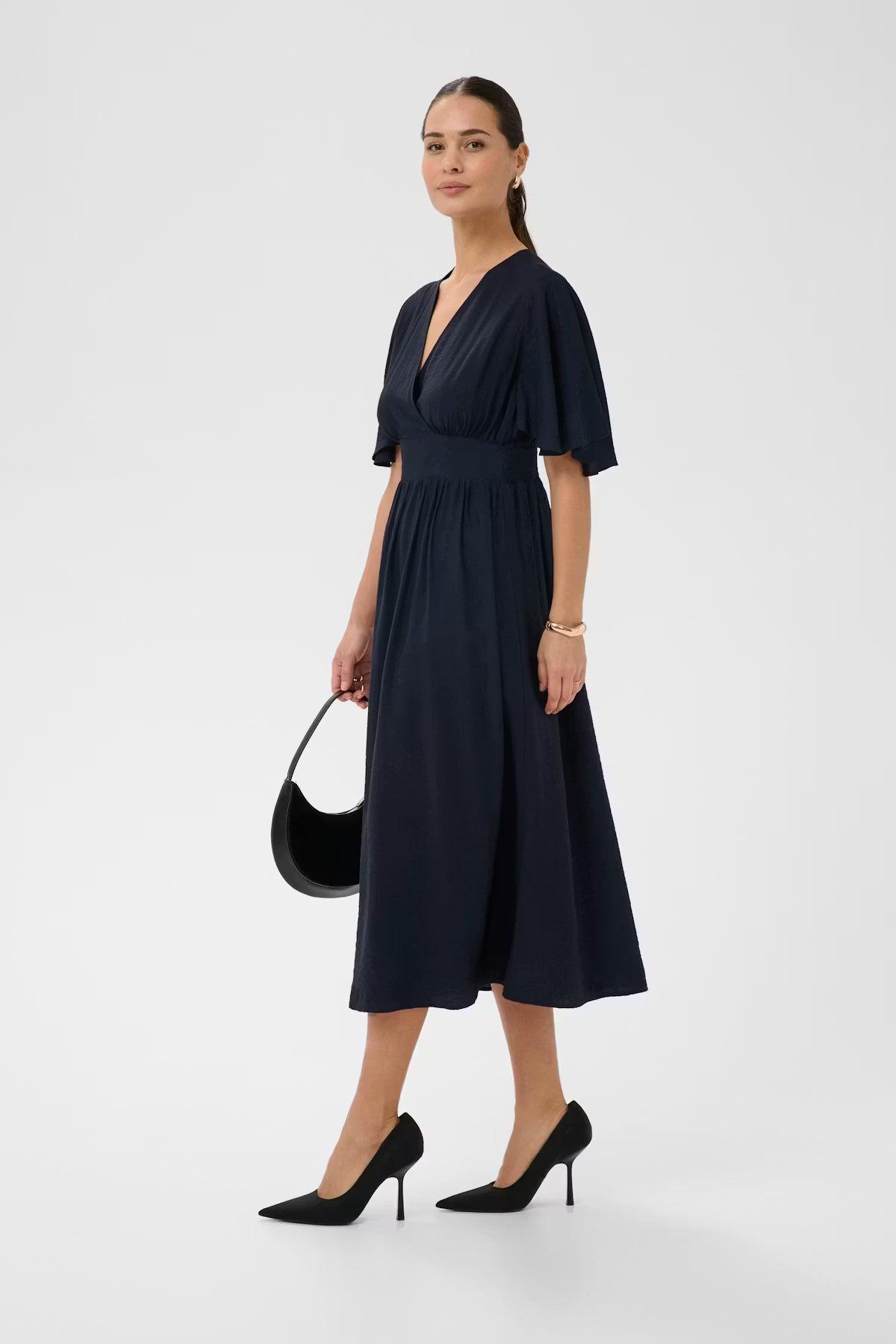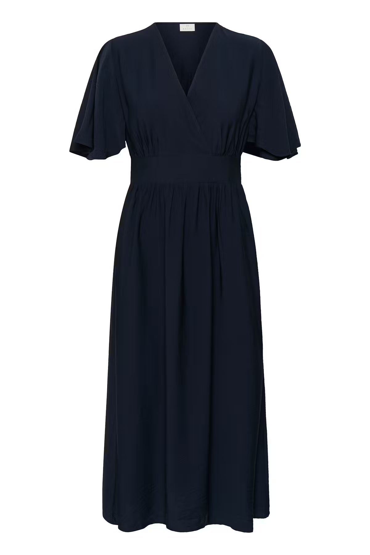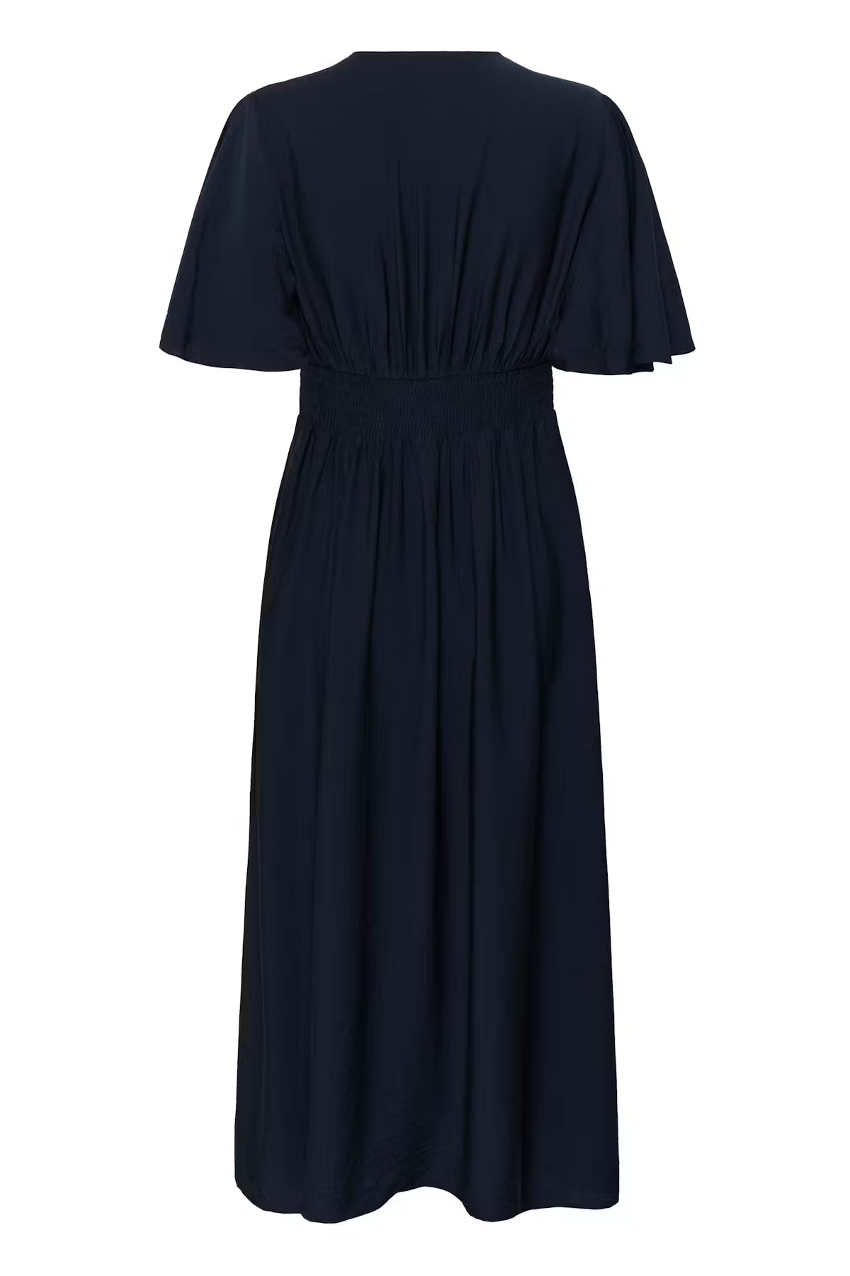 Elegant and effortlessly feminine, this midi dress in Midnight Marine is designed to flatter while offering beautiful movement. A defined waist enhances the silhouette, complemented by a soft V-neckline that adds a touch of sophistication. Relaxed short flutter sleeves bring lightness and ease, creating a graceful, airy feel.
