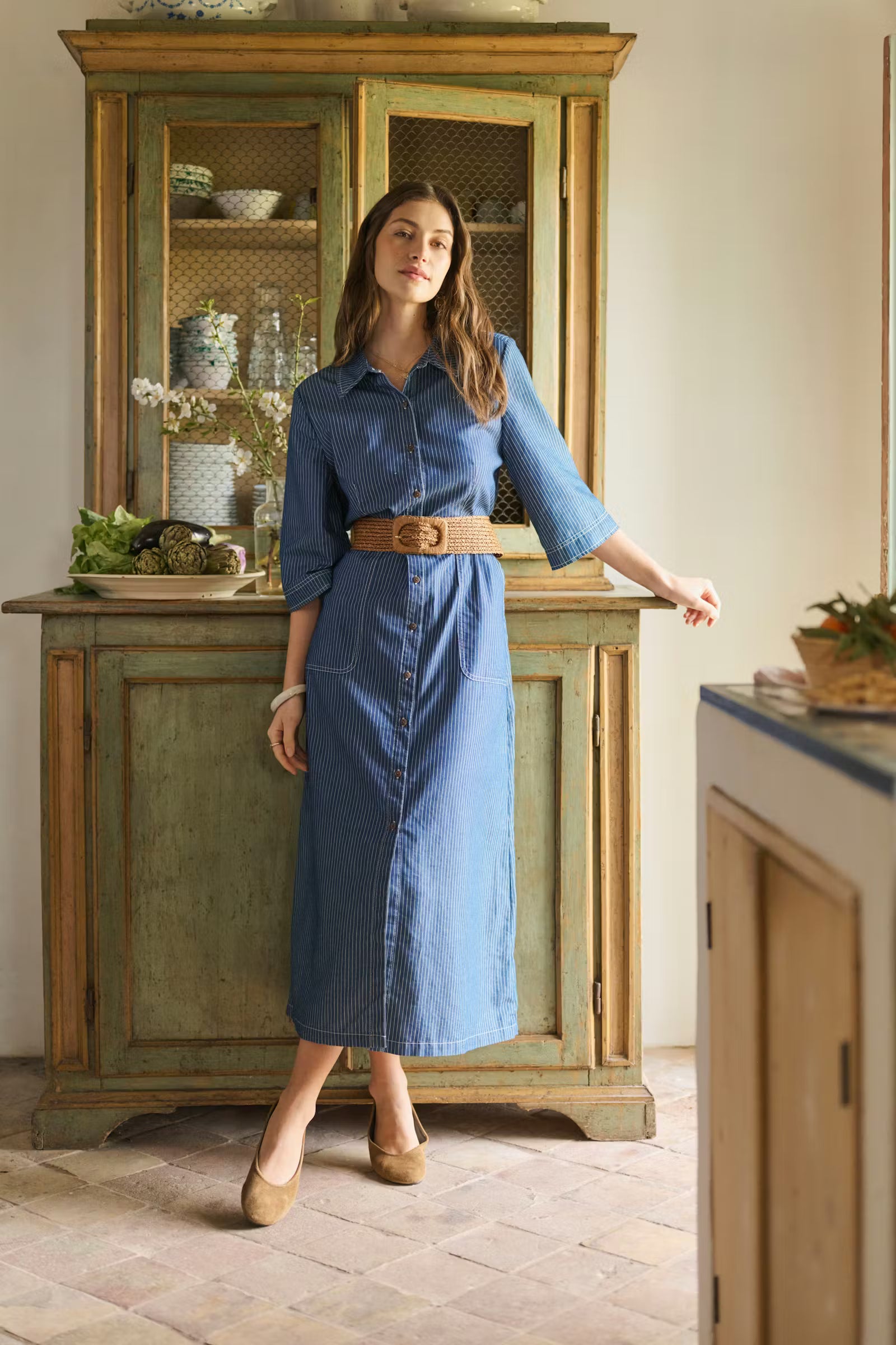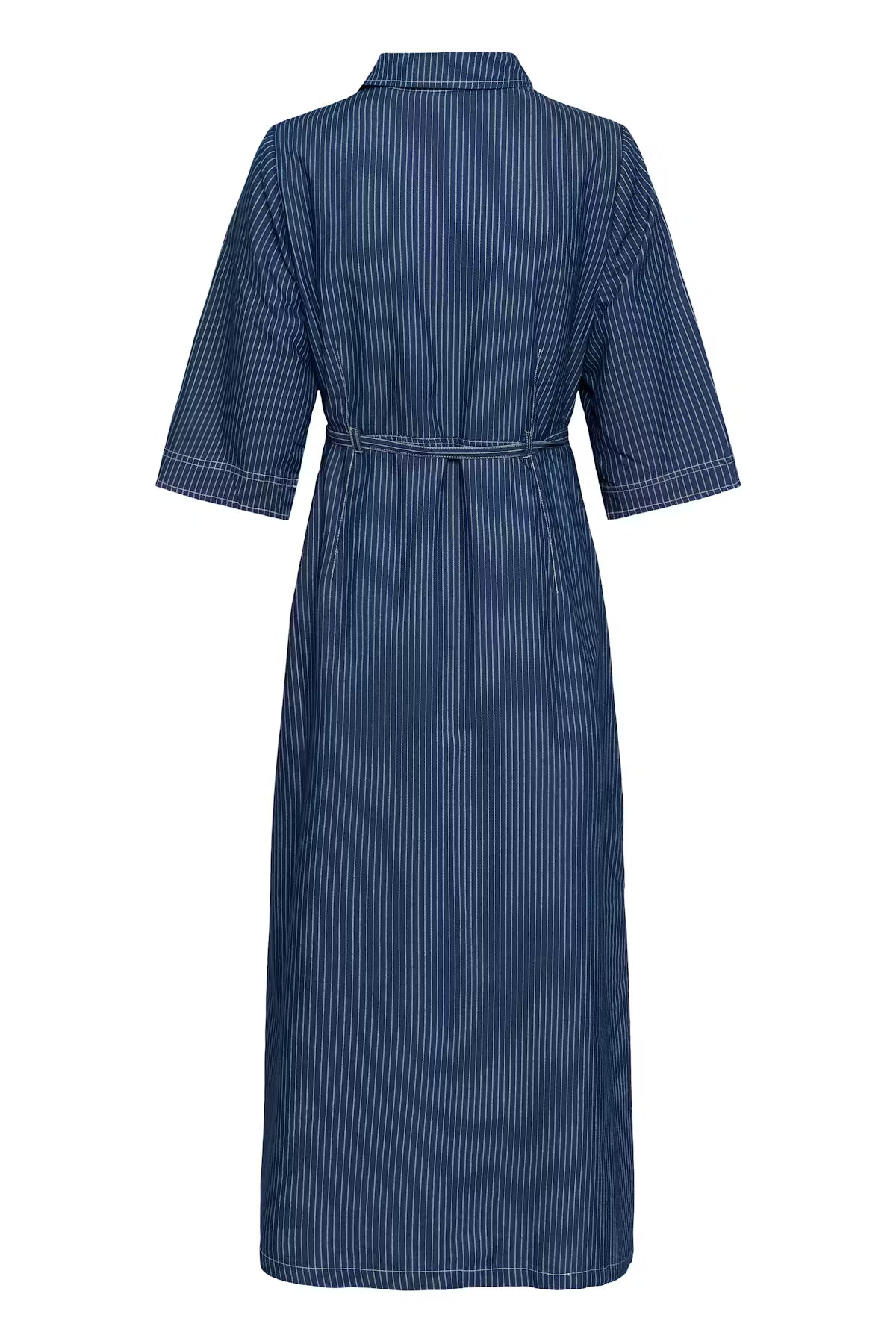 Elevate your everyday wardrobe with this effortlessly refined shirt dress. Designed with crisp vertical pinstripes, it features a smart structured collar and a full front button closure for a timeless, tailored look. The self-tie waist belt allows you to define your shape, while the elbow-length sleeves add a polished yet relaxed feel.